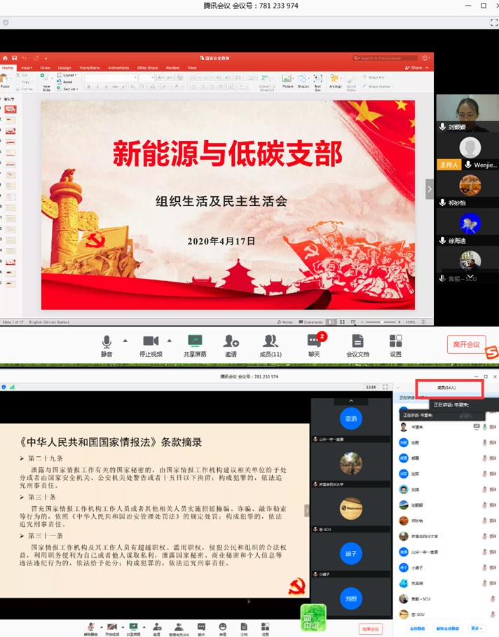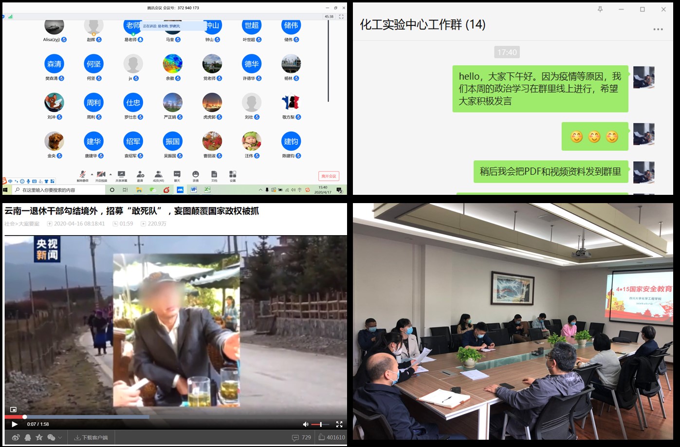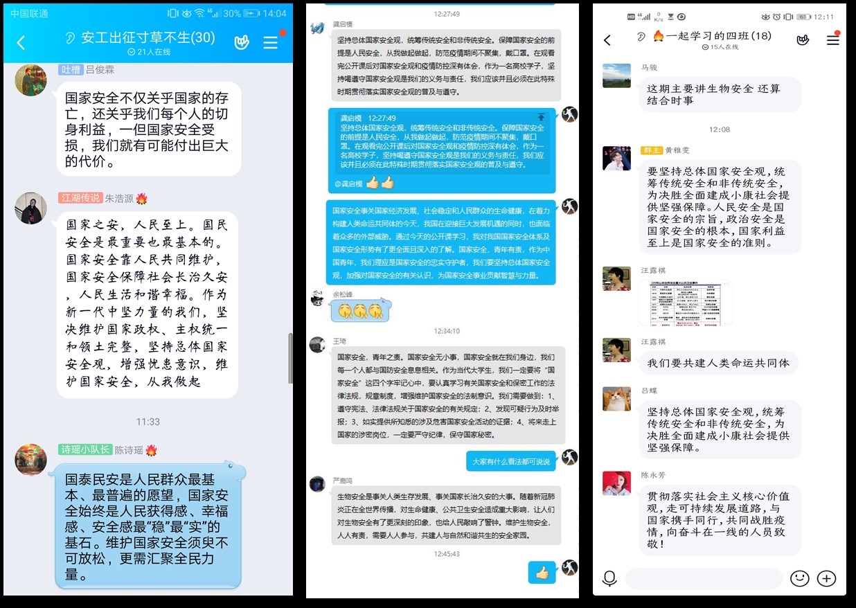 今年教育部一如既往地开展了“千万学生同上一堂国家安全教育课”主题活动。我院工艺专业、生工专业、冶金专业、制药专业、过控专业、安全工程专业的所有班级团支书组织同学于4月14日线上观看了教育部录制的2020年全民国家安全教育日高校公开课,并就公开课内容开展了主题“云”班会进行线上讨论交流学习。同学们都有感而发,通过公开课的学习,对国家安全有了更深的认识和理解,增强了国家安全意识和社会责任感。并承诺在今后的学习生活过程中,会自觉维护国家安全、严格保守国家秘密,为构建安全、和谐、稳定校园而努力。