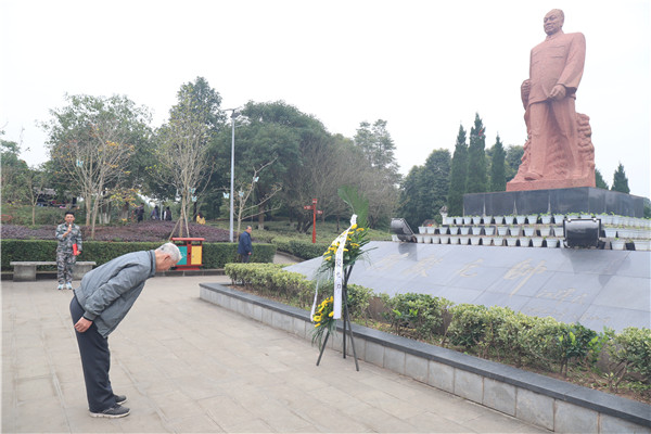 接着,在老领导梁明征老师的带领下,大家向革命先烈敬献花篮默哀并鞠躬致敬。