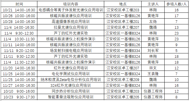 10月10日至11月27日,william威廉英国官网工程实验教学中心顺利开展了共享仪器设备应用培训16场,参培人员主要包括研一新生和高年级本科生共计209人次,培训信息如下表所示。