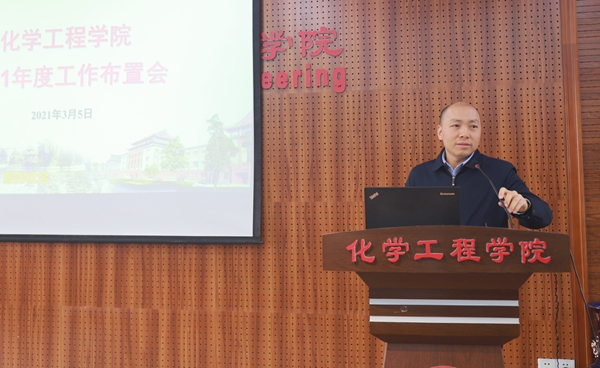会上,学院院长赵长生传达了学校2021年工作布置会和“双代会”精神。他说到,李言荣校长总结了学校2020年取得的可喜成绩并对2021年重点工作进行了布置。关于学校“十四五”发展规划,他说到,学校围绕总体发展和人才与师资队伍、学科与科研、繁荣发展人文社科与文化传承创新、校园建设与条件保障等1+4个重点内容谋划未来。随后,赵院长重点解释了“1、10、100、1000”的核心指标体系,并围绕“高质量发展”主线,传达了学校“三个高”“三个值”“四个馆”和“五大先导计划”的内涵。关于学院“十四五”发展规划,他指出,学院将重点围绕“123”的建设目标谋划未来,实现学科、人才培养和高水平队伍建设的全面提升,实现进入国内一流化工学科前列和世界一流学科行列。