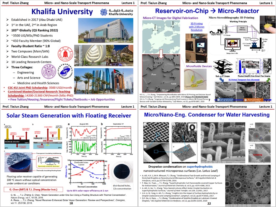 william威廉英国官网2017、2018、2019级三个年级及计算机学院2016、2018级共计五十多名学生参与了课程学习。在课程开始时,张老师给同学们分享了哈利法大学的基本情况和对学生的奖励制度等内容。接着张老师以丰富的图文向同学们介绍超疏水、超亲水等经典微纳现象,介绍了太阳能与水等自然资源的开采与利用背景、微纳米结构光学和润湿性强化界面传输的调控方法,并详细介绍了新型光谱选择性纳米复合材料太阳能吸收器、微/纳米工程蒸汽发生器和冷凝器的输运机理。