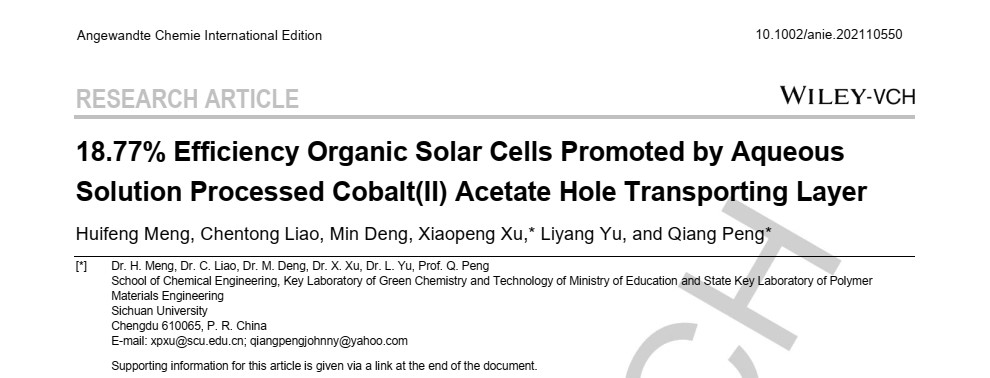 近日,化工学院彭强教授课题组在Angew. Chem. Int. Ed.上发表题为“18.77% Efficiency Organic Solar Cells Promoted by Aqueous Solution Processed Cobalt(II) Acetate Hole Transporting Layer”的研究论文。该课题组开发了一种基于醋酸钴的新型空穴传输层材料及其水溶液绿色制备工艺,将有机太阳能电池二元器件的能量转换效率提高到目前最高的纪录18.77%。william威廉英国官网化工学院为该成果唯一通讯单位。