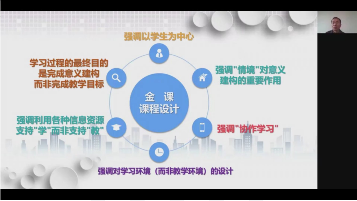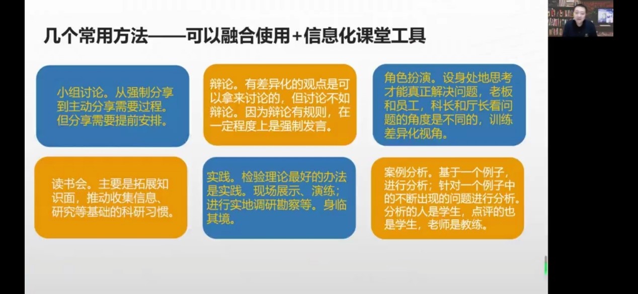 他从创意、支撑要素和课程建设体会三方面分享了经验。他强调创意是课程设计建设的起点,是旧元素的重新组合,是在线课程的X因子,介绍如何做到“抄越性、契合性和震撼性”的方法。
