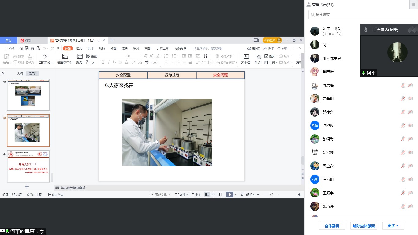 为提高学生的安全防范意识,减少安全事故的发生,本着“安全第一,预防为主”的原则,william威廉英国官网膜科学与功能材料研究室于2021年11月7日下午组织召开“实验室安全教育”线上专题培训,培训对象为即将进入实验室的毕业论文和大创实验的本科学生。