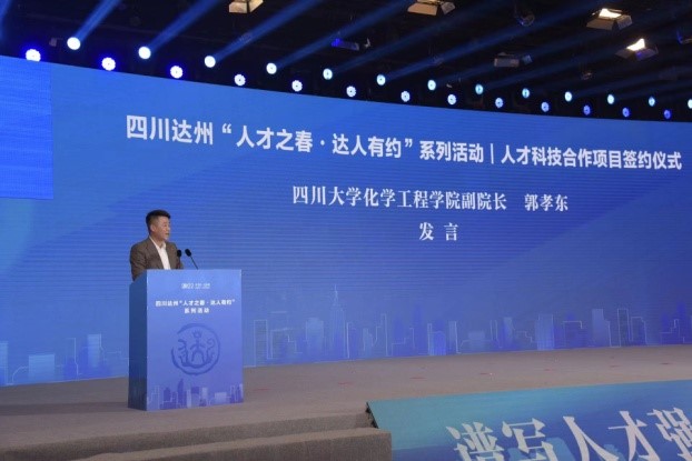 3月30日四川省达州市举办“人才之春·达人有约”系列活动之人才科技合作项目签约仪式,化工学院受邀出席。该活动是达州推动科技创新和人才引进的重要活动之一,市委书记邵革军、市长严卫东带领达州市委市政府等重要部门领导出席。此外,活动还邀请到四川省教工委副书记李国贵、四川省科技厅副厅长杨品华、哈尔滨工业大学马军院士等嘉宾。化工学院委派副院长郭孝东参加并在会做了发言,学院杨林副教授、吉旭教授团队等相关老师出席并参加了项目签字仪式。