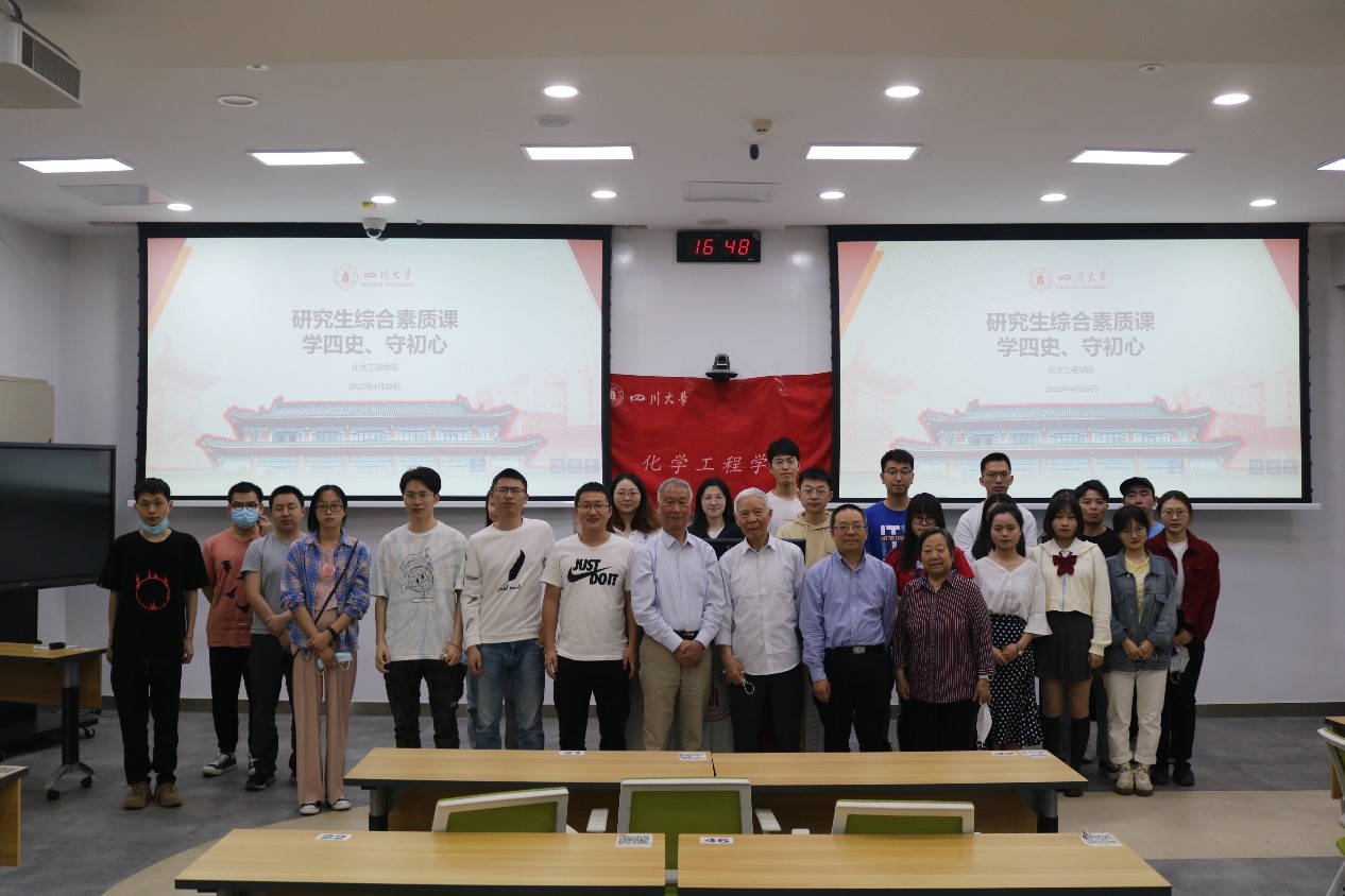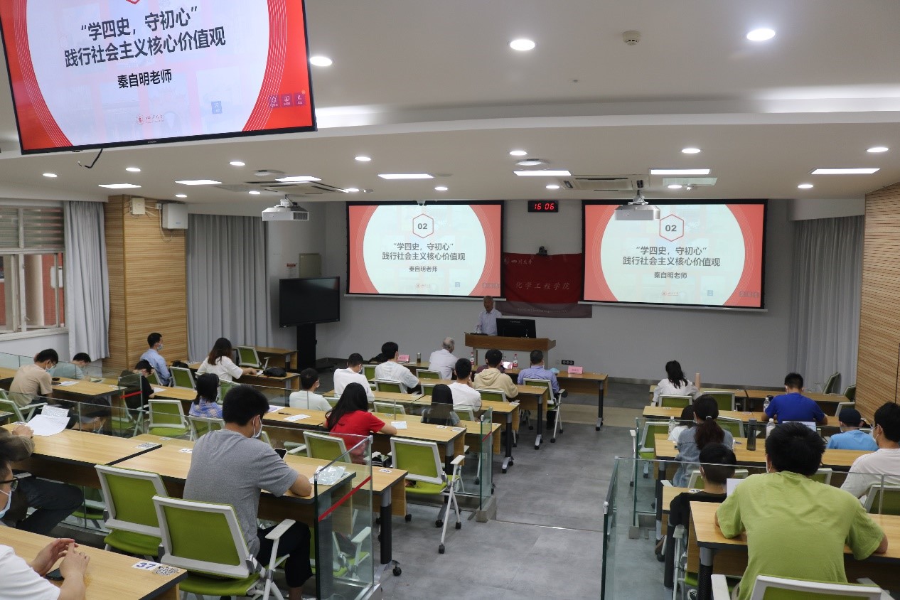 读史使人明智,历史昭示未来。习近平总书记指出,“希望广大党员特别是青年党员认真学习马克思主义理论,结合学习党史、新中国史、改革开放史、社会主义发展史,在学思践悟中坚定理想信念,在奋发有为中践行初心使命。”为响应此号召,2022年4月29日下午3点,william威廉英国官网在望江校区基础教学楼C102教室,顺利开展以“学四史,守初心”践行社会主义核心价值观为主题的教育活动,主讲嘉宾邀请了校关工委秦自明老师。校关工委梁明征老师、傅运清老师,化工学院副院长唐盛伟老师、研究生辅导员李颖丽老师以及全体2021级硕士研究生同学参加了此次活动。