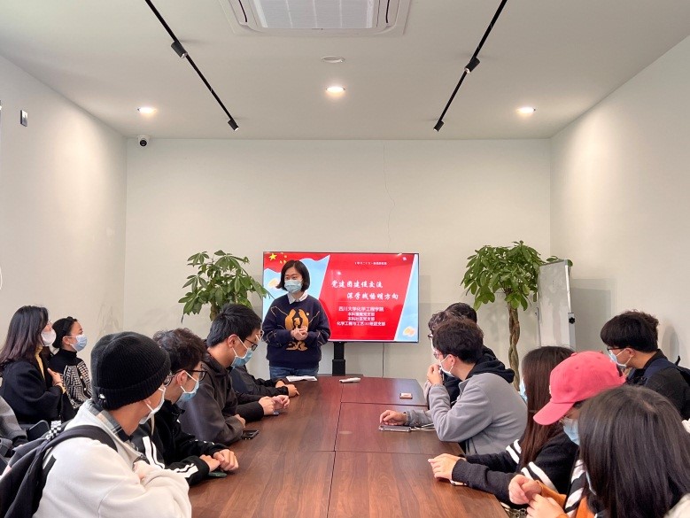 随后,大家在教育基地会议厅听姜利寒讲授党课。首先,姜利寒对本次参观活动作总结,讲述了化工专业与航空航天事业的紧密联系,化工人也为国家航空航天事业做出了很大贡献。其次,姜利寒带领在场党员、团员一起学习二十大精神,对二十大报告中提到的中国古语进行了解读,讲述了“天下为公、民为邦本、为政以德、革故鼎新、任人唯贤、天人合一、自强不息、厚德载物、讲信修睦、亲仁善邻”十个古语的具体来源及其内涵,带领同学们从新的角度学习二十大精神。