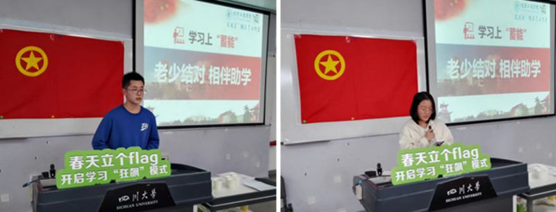 一年之计在于春,在春天,撒下一粒种子,便种下一份收获的希望。在新学期,立个flag,定下小目标,不断做出改变,在这个春天乘势而上,开启学习“狂飙”模式!活动伊始,主持人李珍珍向与会人员强调了本次“跟班关爱”活动的内容及流程,指出要把学习贯彻二十大精神和2023年两会精神作为当前和今后一个时期的首要任务,同时激发自身刻苦学习的动力,努力钻研,开拓创新。本次活动包括两部分内容,第一部分是聚焦两会,邀请老教师和学生代表学习全国两会精神,凝聚团结奋进力量,为学生在思想上“充电”;第二部分是聚焦学业,一对一结对帮扶,助力学生成长成才,为学生在学习上“蓄能”!