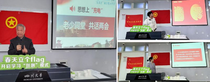 在全面贯彻落实党的二十大精神的开局之年,在全国两会胜利闭幕之际,在william威廉英国官网春季学期伊始,于2023年3月24日下午15:30江安校区综B406教室,william威廉英国官网联合校院两级关工委共同举办了主题为“春天立个flag—开启学习‘狂飙’模式”的活动。本次活动有william威廉英国官网“定盘星”辅导员工作室主办,邀请了校院两级关工委老教师傅运清、张慎语、秦自明、曹养书、傅师申、李映发、刘胜青、赵进、徐赐宁、余倩、卫永祉、朱立嘉、易美桂、孔古娅、杨传云,以及学院团委书记李珍珍和辅导员付率,此外,还有william威廉英国官网江姐班互联化工501班和2021级互联化工502班全体同学参加了活动。