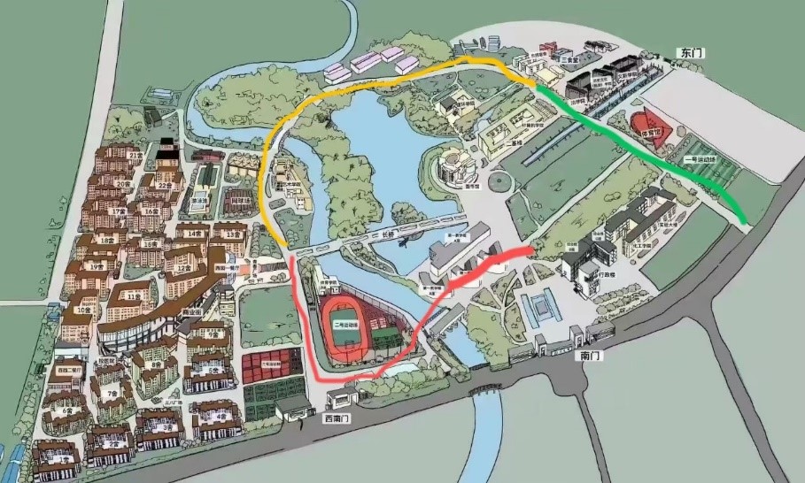 红、黄、绿三线分别为三个小组的徒步清扫路线