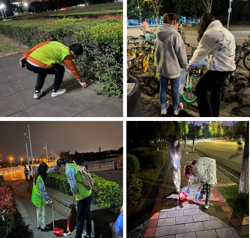 夜晚徒步既可以强身健体,也可以简单弯腰清洁地面垃圾,达成美化校园环境的目的。志愿者们兴致勃勃,活动开始后各组便有序分工,密切合作,有人拿着大扫把归拢落叶,有人拿着小扫把清扫废纸屑,有人扶起倒下的共享单车、捡走车筐中的垃圾,还有人捡拾鹅卵石夹缝中的烟蒂,活动在大家的踊跃参与中顺利进行。