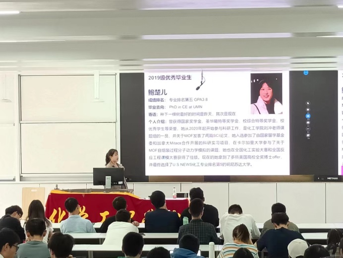 2019级优秀毕业生鲍楚儿,获得明尼苏达大学offer,就自身成功留学的经验进行了十分详细的介绍。鲍楚儿学姐不仅为同学们区分了课硕、研硕以及PHD三种深造学位,同时还从出国留学的要求、如何选校、英语水平要求和申请流程等多个方面讲述了留学的准备事项及注意事项,让到场的同学们对留学的过程有了更加清晰地认识和了解。