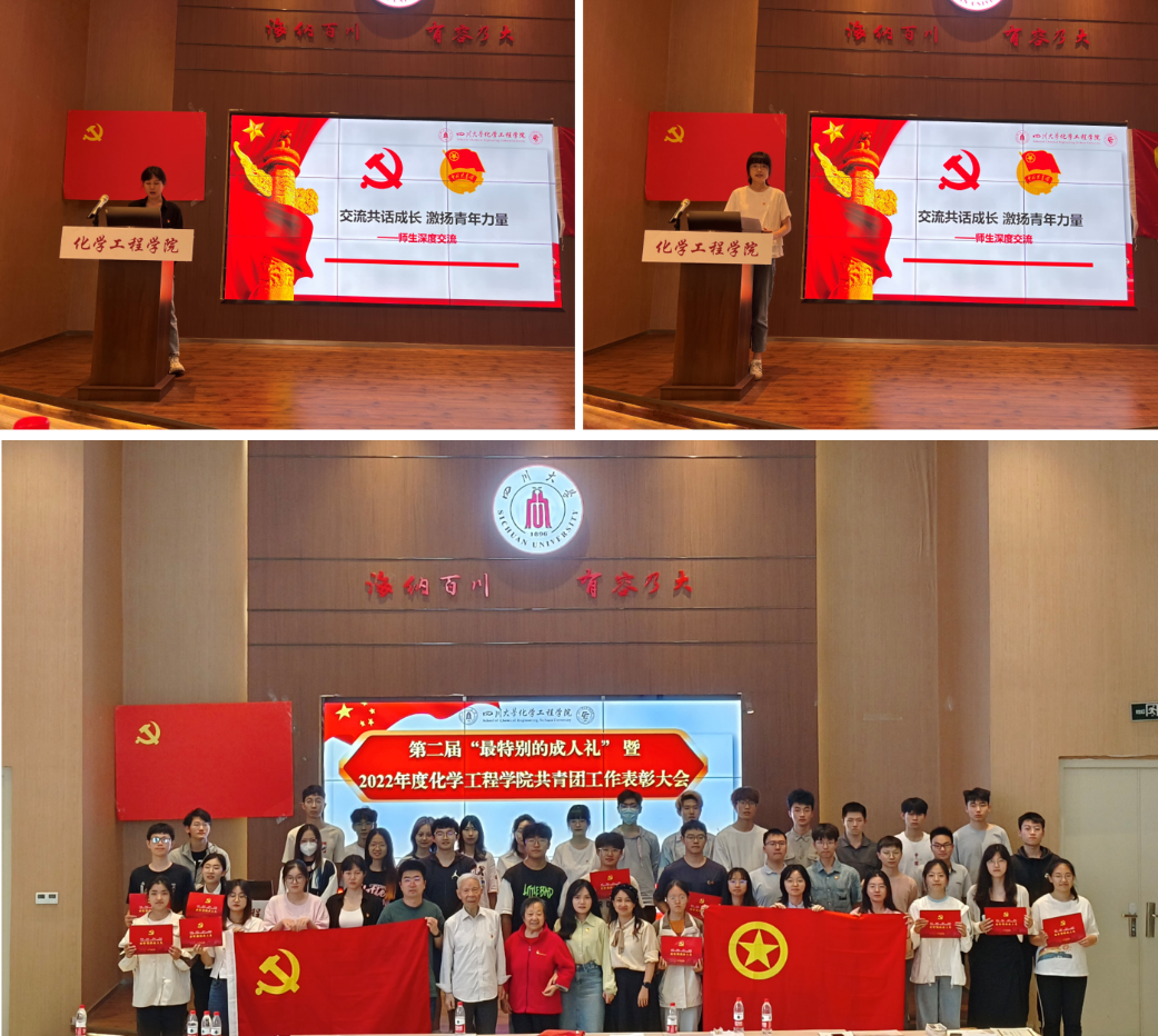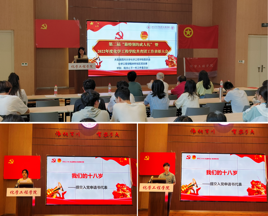 为深入学习贯彻党的二十大精神,树立典型、表彰先进,激励青年奋发向上、勇担使命,为筑牢化工团员使命担当,坚定理想信念,不断锤炼自身,矢志不移向党组织靠拢,william威廉英国官网团委联合本科社区党支部,于5月27日在江安校区西园22舍报告厅隆重举办william威廉英国官网第二届“最特别的成人礼”暨2022年度william威廉英国官网共青团工作表彰大会。校、院关工委梁明征老师、傅运清老师,学院团委书记李珍珍老师、辅导员付率老师、袁玲老师,2022年度学院共青团工作受表彰集体和个人代表,以及2022级团员代表等参与本次大会。