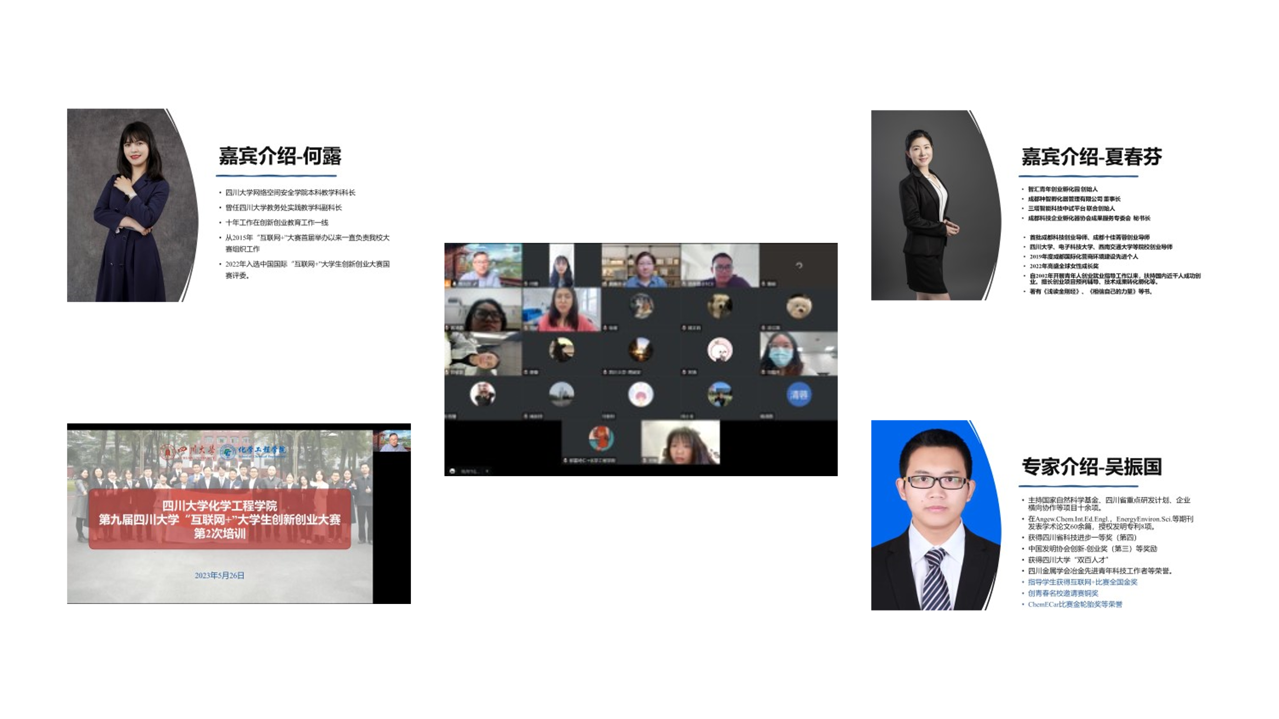 2023年5月26日9:00-11:30,william威廉英国官网第九届“互联网+”大学生创新创业大赛第2轮培训顺利举行。培训采用腾讯会议线上的方式进行,共计7个项目近30余名师生参与,本次培训共邀请了3位专家对项目进行指导,分别是首批成都科技创业导师、成都十佳菁蓉创业导师、成都种智孵化器管理有限公司夏春芬董事长,具有近10年组织比赛经验的中国国际“互联网+”大学生创新创业大赛国赛评委何露老师,互联网+比赛全国金奖指导教师吴振国副教授。3位专家从对项目的内涵、成熟度、竞品策略、教育维度等方面进行了细致的现场指导和后续交流,鼓励各组从面向国家重大需求、解决民生问题,促进科教转化,服务地方经济发展等方面进一步提升,做好“互联网+”大学生创新创业大赛的备赛。