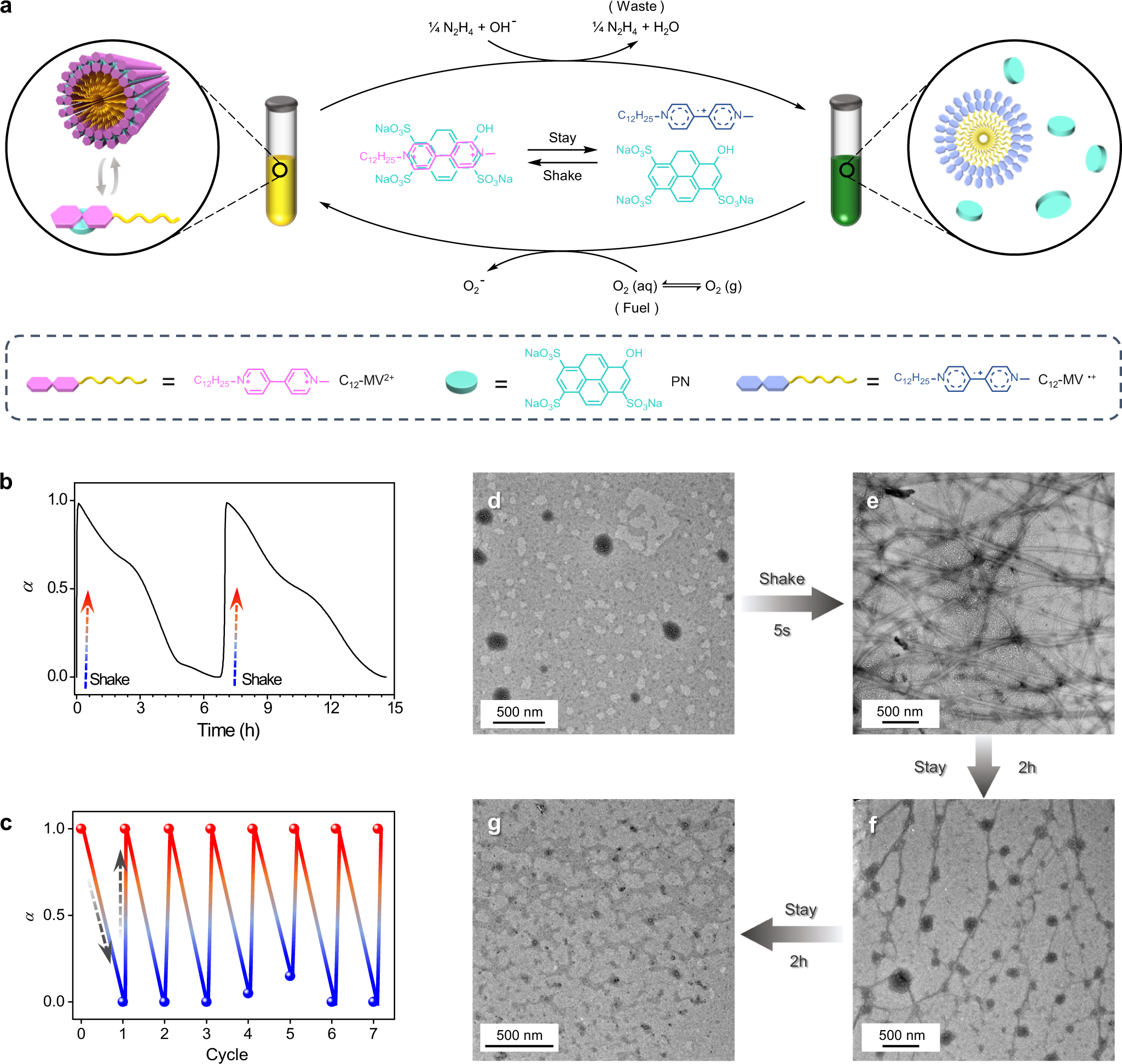 赵辉教授团队在非平衡态自组装领域进行了长期的研究,并取得了系列的进展。近日,该团队在非平衡态领域取得了新的突破。受生命体内化学燃料驱动的耗散自组装的启发,该团队利用甲基紫精可逆的氧化还原特性,构建了密闭系统中机械敏感的非平衡态超分子自组装体系,并解决了非平衡态系统中所存在的废料堆积问题。