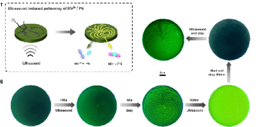 该封闭系统通过简单的摇晃即可实现瞬态的超分子自组装。此外通过调控甲基紫精的结构,可以实现摇晃驱动的瞬态荧光增强或瞬态荧光淬灭。并且通过使用超声作为驱动力,利用此体系,他们构建一个瞬态荧光图案化体系。