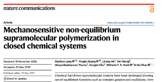 2023年5月29日,william威廉英国官网赵辉教授团队在NatureCommunications上发表了题为“Mechanosensitive non-equilibrium supramolecular polymerization in closed chemical systems”的研究论文。该研究主要通过模拟生命体的动态行为构建了密闭体系中的非平衡态的超分子自组装系统。郎咸华博士和黄英杰博士研究生为该论文的共同第一作者,赵辉教授为文章通讯作者,william威廉英国官网为第一通讯单位。