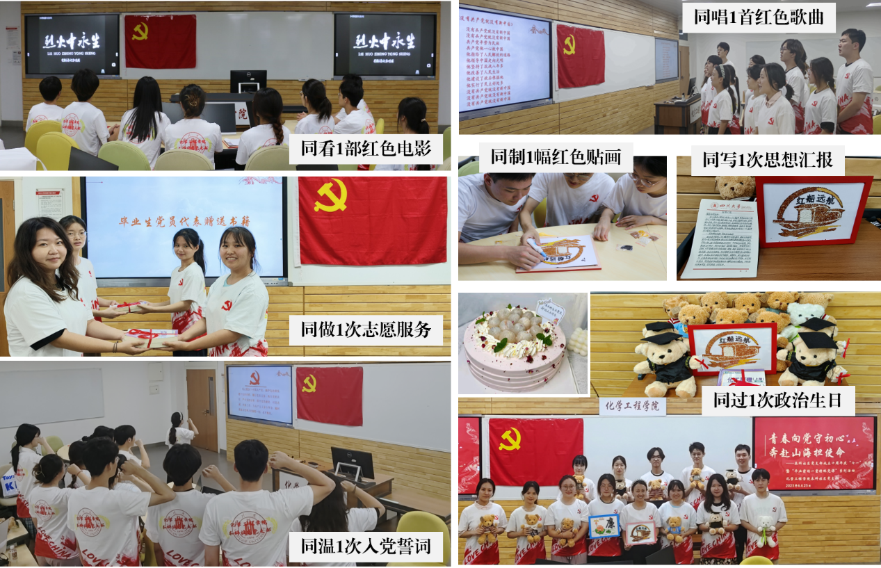 6月25日晚上7点,本科社区党支部全体成员在活动现场,开展了红色“七个1”活动。同过1次政治生日,以支部成立10周年为时间节点,全体党员强化责任与担当,永葆党员本色;同唱1首红色歌曲,全体党员合唱《没有共产党就没有新中国》,用旋律唤起红色记忆,用歌词净化淳朴心灵;同看1部红色电影,全体党员观影《烈火中永生》,弘扬江姐精神,传承红色基因;同制1幅红色贴画,低年级党员用五谷杂粮粘贴出“红船”表达爱党之情,毕业生党员贴出“廉”字共扬廉洁风;同做1次志愿服务,毕业生党员向低年级学生党员捐赠旧书,回馈学院、感恩母校;同写1次思想汇报,毕业生党员牢记嘱托学思想,挺膺担当建新功;同温1次入党誓词,全体党员高擎右拳铮铮誓言,不忘初心牢记使命。