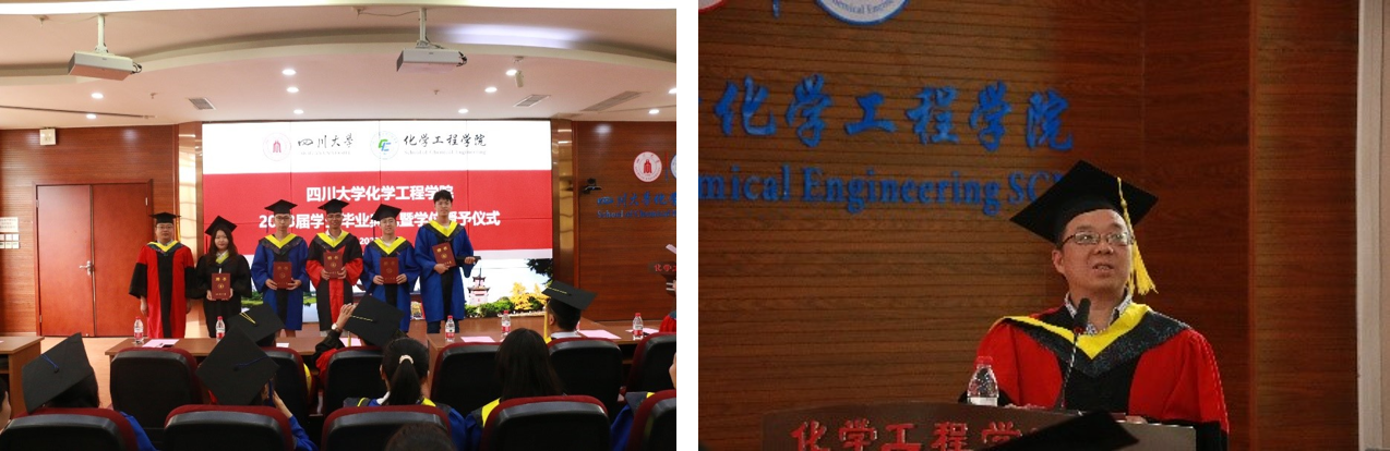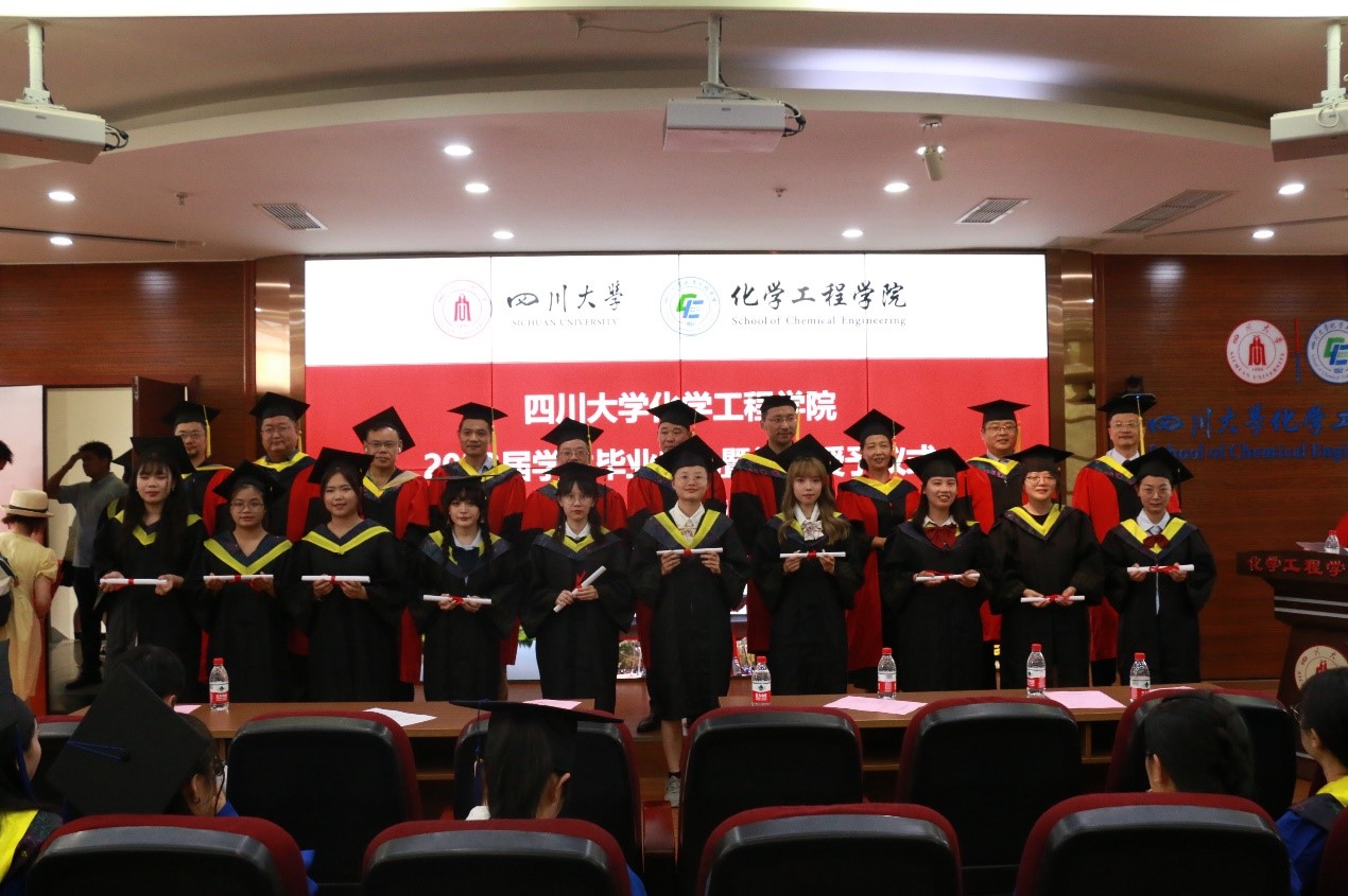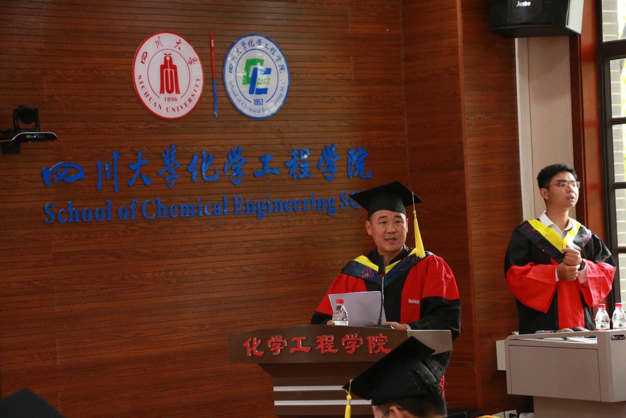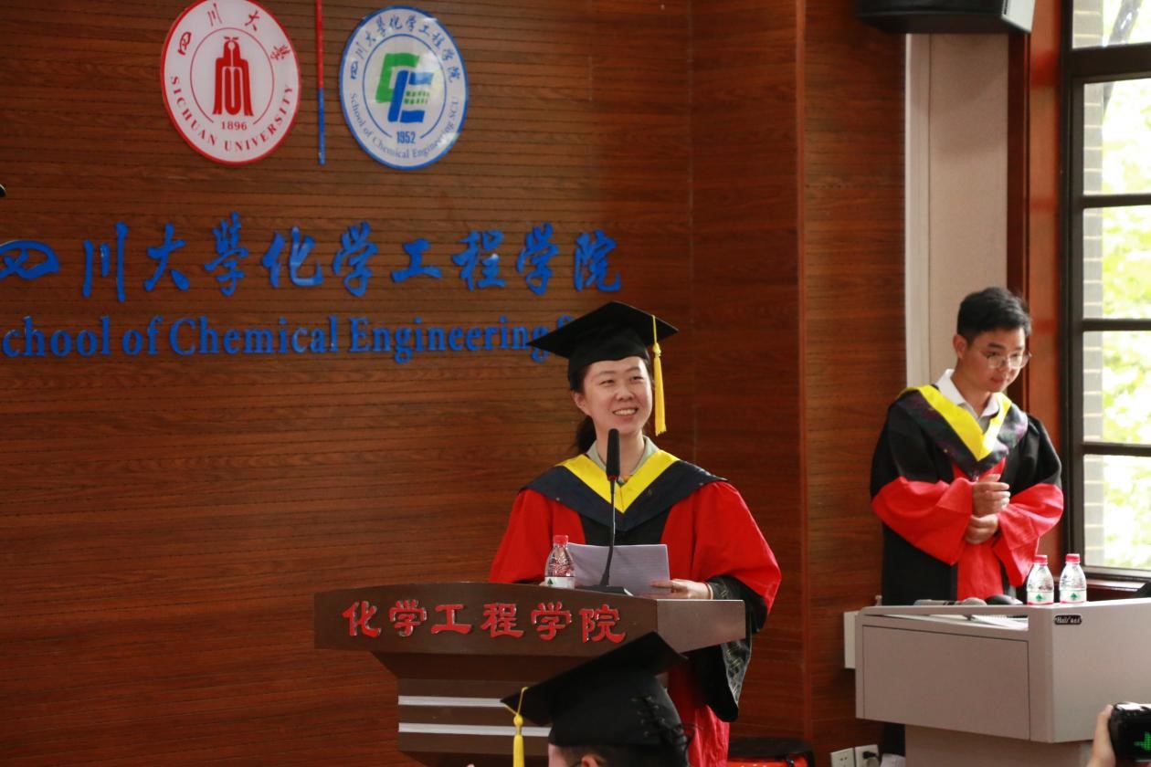 毕业本科生学生代表张雪发言。我们的本科生涯即将迎来终点,但这只是漫漫人生求知求学之路的开端。将要迈出校门的我们,应当胸怀“开放、包容、厚重、大气”的川大气质,努力成为堪当时代大任的化工新人,面对未来崭新的机遇和挑战。毕业研究生学生代表邱浪上台发言。毕业既是结束也是开始,我们都将奔赴下一个阶段。“海纳百川,有容乃大”,当初我们汇聚于此,现在也将奔赴五湖四海。作为川大化工人,未来的我们将更加努力,传承老一辈工作者的奋斗精神,更好的诠释川大人、化工人精神风貌和工作作风!在每个工作岗位做好川大榜样。