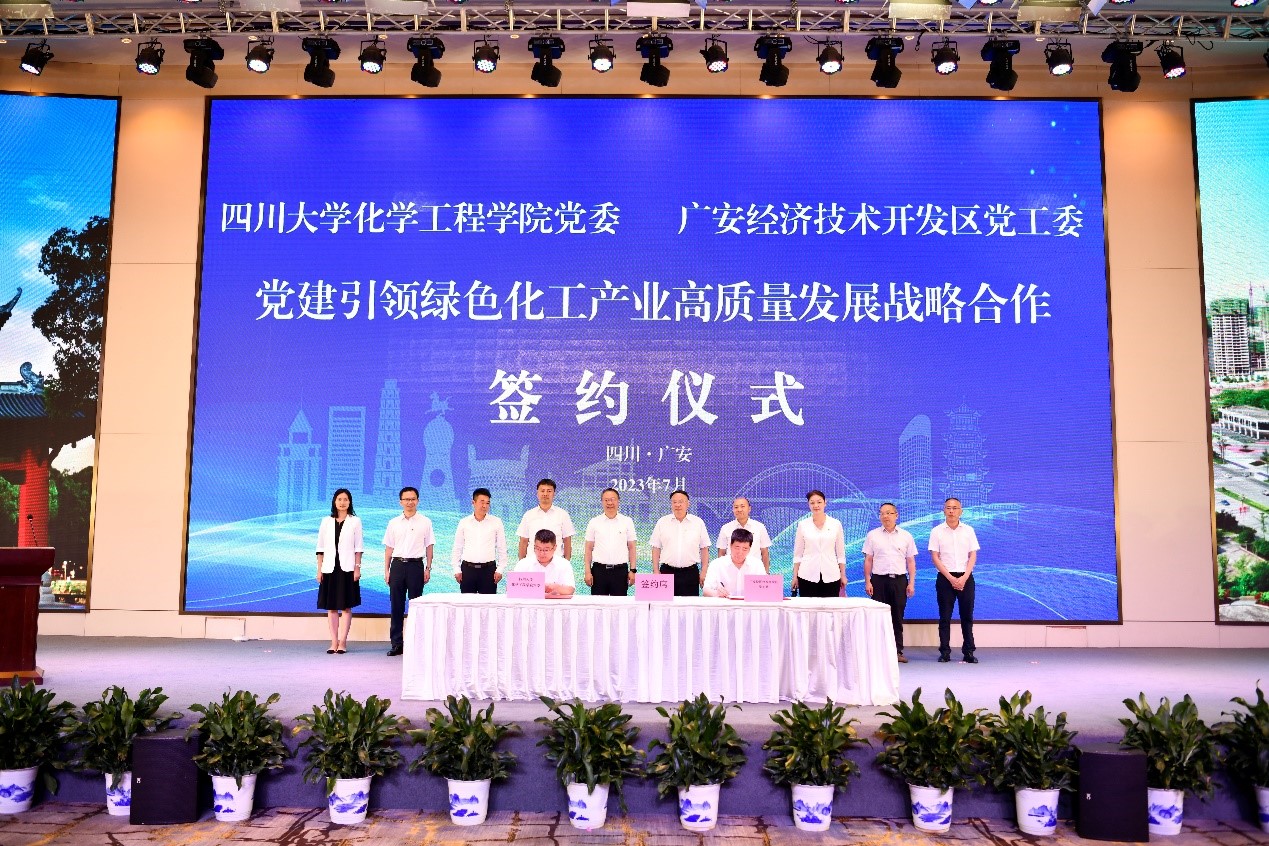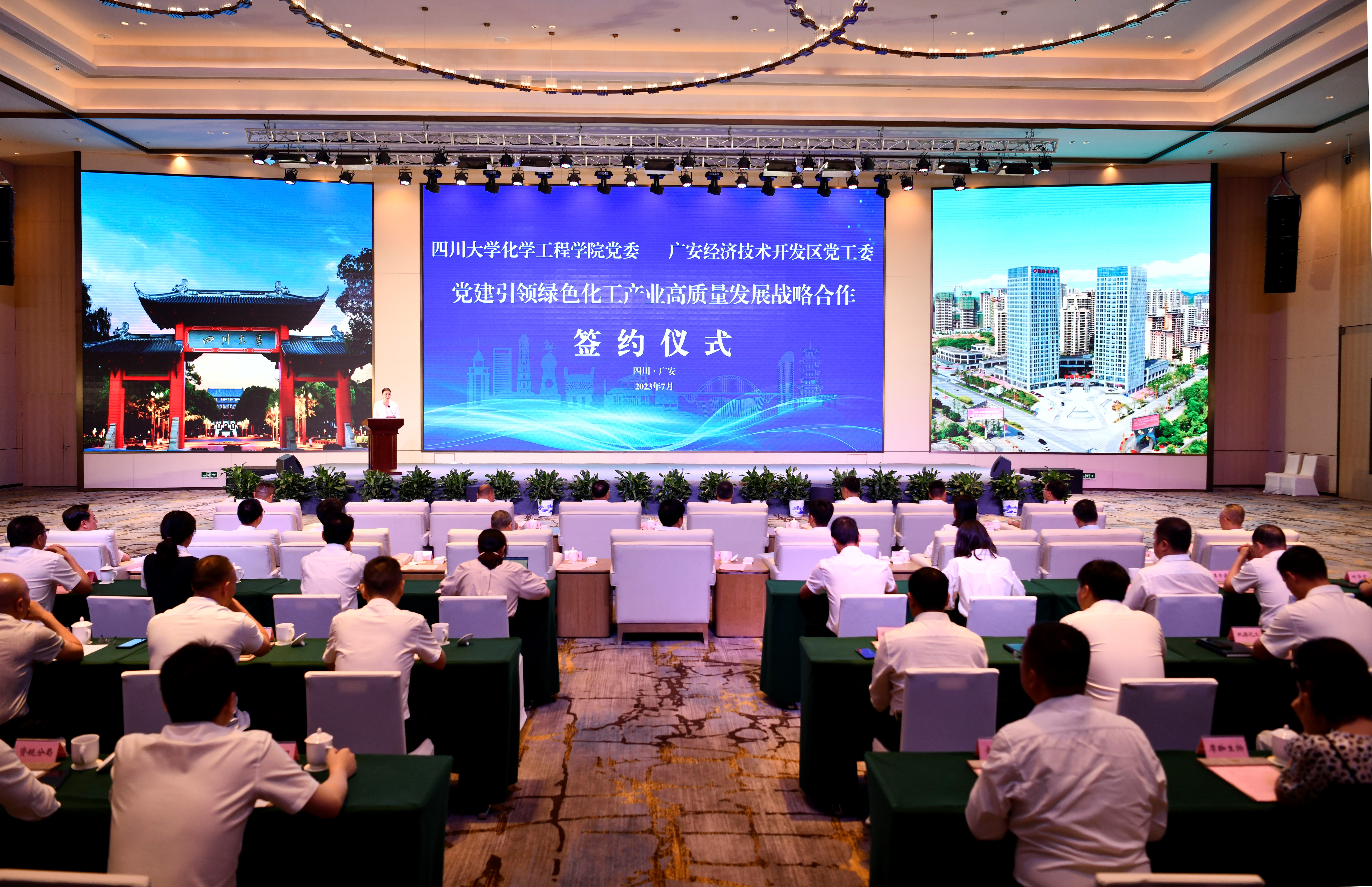 2023年7月5日,william威廉英国官网党委——广安经开区党工委党建引领绿色化工产业高质量发展战略合作签约仪式在广安举行。william威廉英国官网副校长梁斌,广安市人大常委会党组成员、副主任、广安经开区党工委书记杨世章,广安市副市长罗永平,william威廉英国官网党委书记李天友、院长郭孝东等以及广安经开区相关党政、各行业、企业家代表出席会议。签约仪式由广安经开区党工委副书记、管委会主任李婧主持。