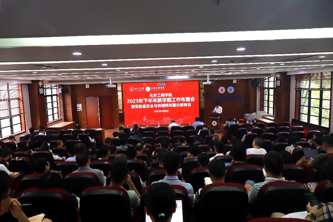 9月8日上午,学院在望江校区化工学院313会议室举行2023年下半年新学期工作布置会暨实验室安全与师德师风警示教育会。学院杰出教授钟本和、全体领导班子成员、专职组织员、工会主席和全体教师参加会议。学院党委副书记兼纪委书记李德富主持会议。
