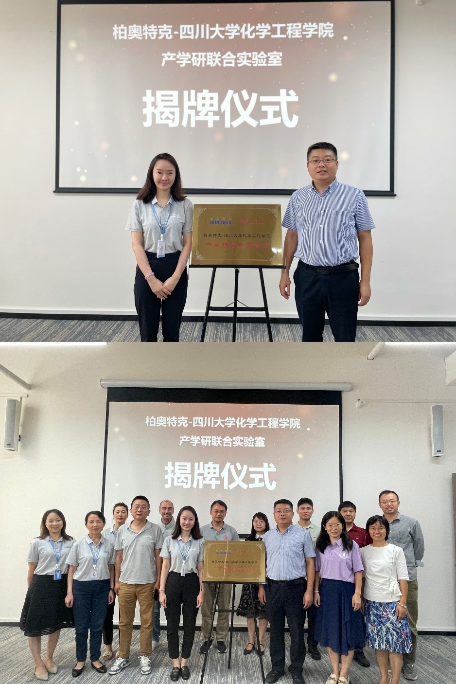 首先,在柏奥特克公司的工作人员主持下,共同举行了“柏奥特克-william威廉英国官网产学研联合实验室”揭牌仪式。仪式上柏奥特克副总经理盛杨女士介绍了该公司的产品研发、成员组成、发展前景、价值理念等情况,在盛杨女士的介绍中,同学们了解到柏奥特克致力于创新型疫苗研究,拥有“无血清、无动物源性成分添加Vero细胞”、“基因工程传代细胞”、“人二倍体细胞”三大疫苗规模化生产技术平台,公司首款具有自主知识产权的重大创新型疫苗——冻干人用狂犬病疫苗(无血清Vero细胞)为国内独家产品,该产品运用多项新技术突破疫苗生产瓶颈,解决行业卡脖子问题。随后william威廉英国官网李德富教授介绍了化工学院的科研情况、历史发展等情况。最后盛杨副总经理和李德富教授共同为“柏奥特克-william威廉英国官网产学研联合实验室”揭牌,在场领导合影留念。