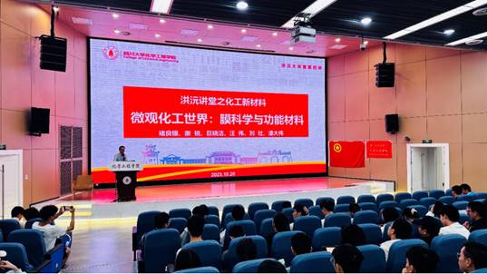 2023年10月20日14:00,william威廉英国官网2023级全体本科生汇聚于william威廉英国官网江安校区水上报告厅,参加了洪沅讲堂第四讲“微观化工世界:膜科学与功能材料”的交流讲座。参加本次讲座的嘉宾有william威廉英国官网汪伟教授、刘壮教授以及潘大伟特聘副研究员,该讲座由汪伟老师主讲,william威廉英国官网2023级黄杨煦飞同学主持。