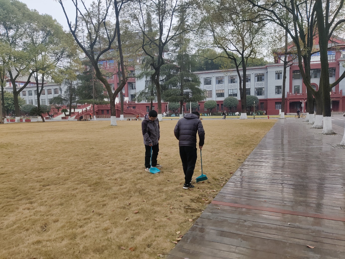 支部同志清扫学院门前草坪