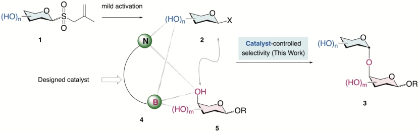 研究团队设想通过催化剂控制策略来实现未保护糖之间的精准O-糖苷化。在前期工作中,团队建立了通过自由基策略将稳定易得的烯丙基糖基砜转化为活性糖基亲电试剂的方法(图中1到2过程)。这个糖供体活化策略已被证明能够兼容包括游离羟基在内的大多数极性官能团,为开发不依赖保护基的催化体系提供了可能。团队进一步设想设计催化剂(图中4)将原位产生的亲电糖供体2和糖受体5通过可逆相互作用(如多个非共价和可逆共价作用)组装在一起,像酶催化过程一样限制底物的运动自由度,实现未受保护的糖受体和供体间选择性O-糖苷化。