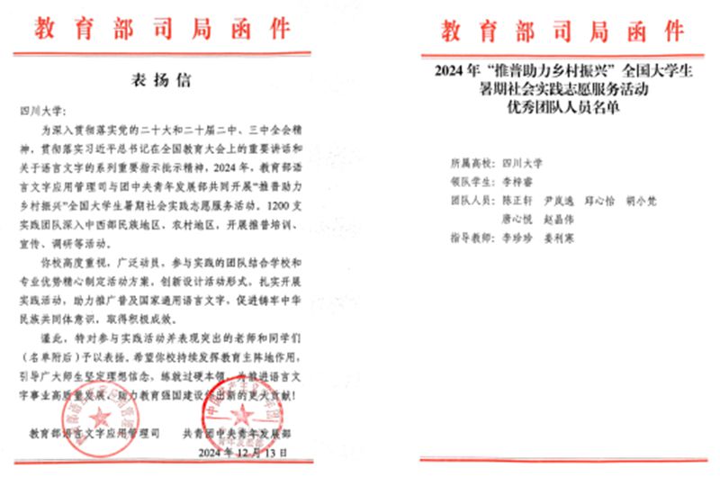 教育部语言文字应用管理司和共青团中央青年发展部来信表扬,充分肯定了我院师生团队在助力推广普及国家通用语言文字,促进铸牢中华民族共同体意识方面的贡献与付出。