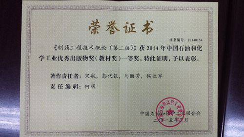 由中国石油和化学工业联合会开展的优秀出版物奖的评审结果近日揭晓,我院由宋航老师担任主编、马丽芳老师担任副主编,制药工程专业部分教师参与编写的教材《制药工程技术概论(第二版)》(化学工业出版社)荣获2014年度中国石油和化学工业联合会优秀出版物奖(教材奖)一等奖。