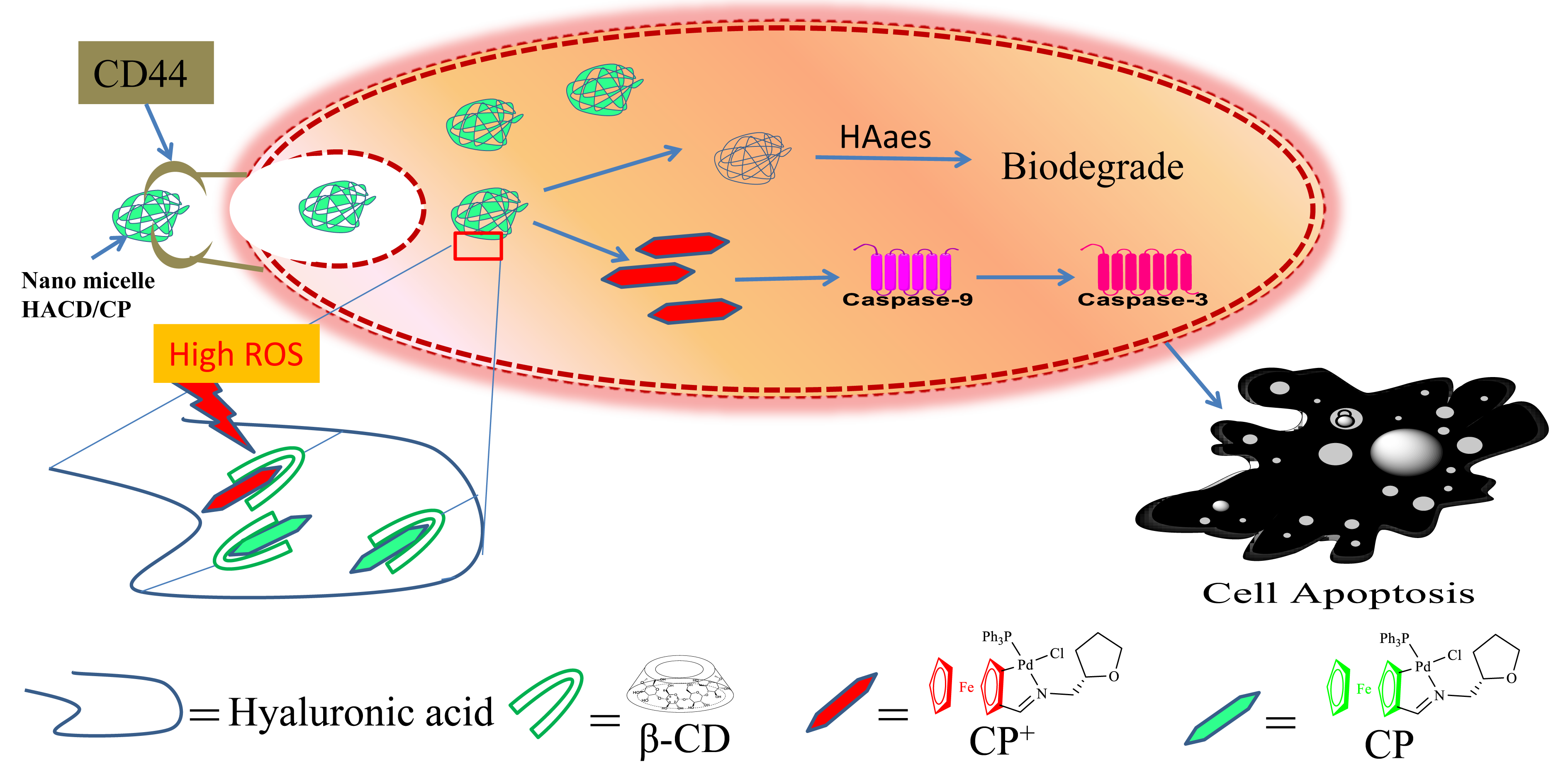 此次,赵刚教授课题组针对环钯化合物靶向性不强等缺点,将二茂铁环钯化合物搭载于透明质酸/β-环糊精上,制备了出具有靶向CD44并能通过ROS刺激响应释放药物的智能纳米胶束。实现了多重靶向肿瘤细胞目的。借助纳米靶向智能载体,在一定程度上减弱了其毒副作用,为环钯化合物用于抗肿瘤研究提供了新的思路。