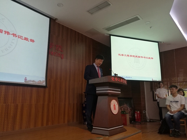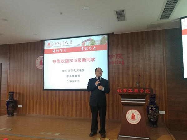 紧接着,由唐盛伟副院长进行专题讲座。唐院长围绕新学期、新阶段、新方法、新生活四大主题逐一展开,由浅入深地为同学们上了开学第一课。他首先详细地介绍了我院的办学历史、师资力量、教学设施及专业特色,阐述了我院所具备的雄厚科研实力。接着,唐院长提出了新时代人才培养的新标准,期望广大新生摒弃过去被动、消极地学习,要将创新、热情融入到科研当中,主动学习,做问题的解决者,做祖国未来化工事业的接班人。同时,唐院长还表示,从事科研要从心态、能力、素质各方面入手,修文、修武、修行,有恒心、有信心、有耐心,切不可三天打鱼两天晒网。最后,他诚挚地祝愿同学们在川大快乐生活、快乐学习。