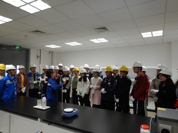 同学们到达陶氏化学四川工厂后,陶氏化学北亚区改进经理李东升和陶氏化学四川工厂安全经理汪涛首先给同学们进行了安全培训,同时为介绍了陶氏化学整体情况、EHS理念和管理规范,让同学们了解到现代化工企业从设计、建设到运营始终以环保、健康和安全为前提的。随后同学们分两组,带上了安全帽、护目镜、手套等个人防护装备,分别在李东升和汪涛两位经理的带领下对陶氏化学四川工厂的生产线和实验室进行了参观。两位经理为同学们细致地介绍了从聚合物单体原料到最终的产品检验、包装、物流的整个生产工艺流程,以及废水处理系统。所到之处各岗位负责人都热情地为同学们介绍了各岗位的作用,职责和安全生产规范,让同学们充分感受到了化工人的骄傲和自豪。
