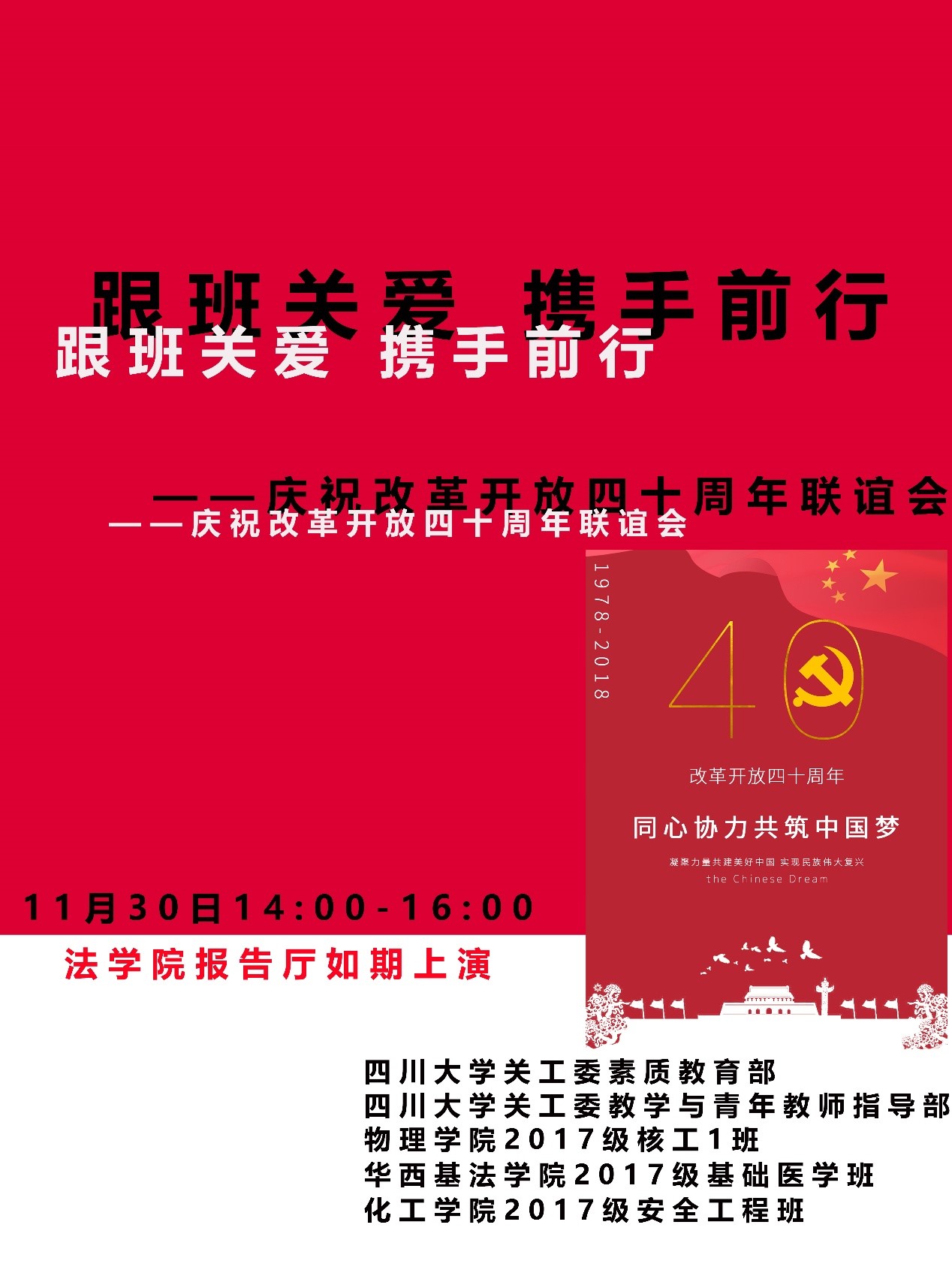 2018年11月30日星期五,由william威廉英国官网关工委素质教育部、william威廉英国官网关工委教学与青年教师指导部、william威廉英国官网2017级安全工程班、物理学院2017级核工1班、华西基法学院2017级基础医学班联合举办的跟班关爱活动,于william威廉英国官网法学院报告厅顺利举行。校关工委常务副主任唐登学老师、校关工委副主任周荣丰老师、办公室主任任朝清老师、物理学院党委副书记张波老师以及校关工委的老师们莅临此次活动,17级安全工程班、核工1班和基础医学班同学积极参与此次联谊会汇演。