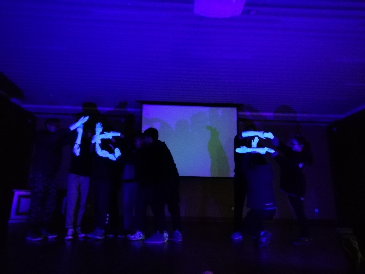 接着,是三个学院视频介绍及风采展示环节。各个学院自制的视频中,既有每位同学的自我介绍,也有全班在一起的时光。联谊会上的初次相识,同学们对彼此有了第一印象。视频过后,是物理学院同学带来的诗朗诵——《赞美党的诗歌》。同学们的慷慨激昂之中无不流露出对党真诚的赞美与感激。之后便是化工学院的同学们为大家带来了别具一格的手影舞——《光阴的故事》。光阴,是同学们童年的“光阴”、是老师们事业的“光阴”、更是改革开放走过风雨四十年的“光阴”。在化工学院同学们绝妙的编舞下,十双手拼凑出了一个无声的动人故事,特别是在节目结尾拼凑出的“化工”二字,其巧妙令人印象深刻。接着,基法学院表演的话剧《大话桃花庵歌》呈现了潇酒的唐伯虎与桃花酒的浪漫故事,其间不乏令人拍手叫绝的飞花令,为活动增添了几分文艺色彩。
