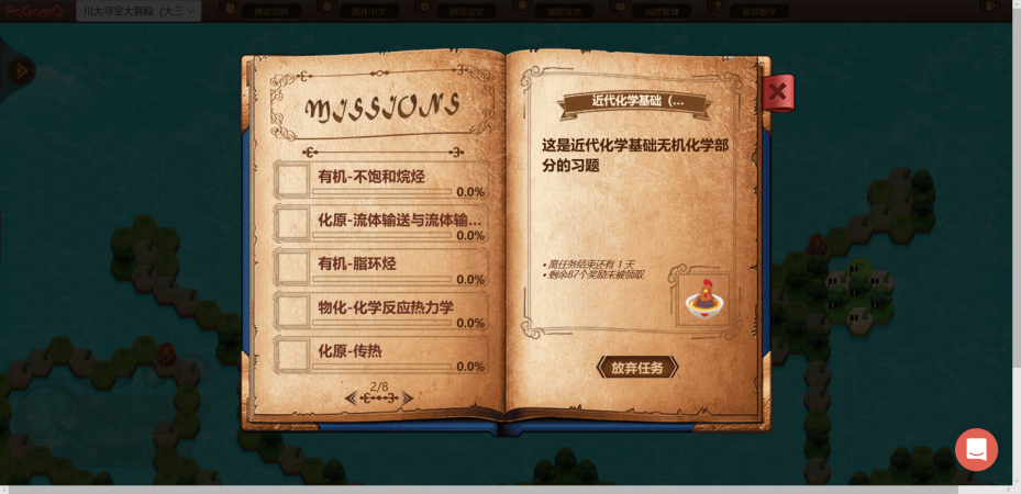 2018年12月9日,海纳杯化学争霸赛第一场-工科综合化学于互联网+竞技化教学PaGamO平台顺利开赛。本次比赛根据余徽副院长建议,由工科化学基地朱权主任于10月份开始进行统筹规划、委托周加贝和赖雪飞老师负责具体筹划和实施,调动近代化学基础有机和无机、物理化学和化工原理等教研室主任和多位老师进行题库设计和在线答疑。比赛过程中,学生将通过比拼习题的正确率和速度抢占PaGamO中的土地,购买道具,建设家园。