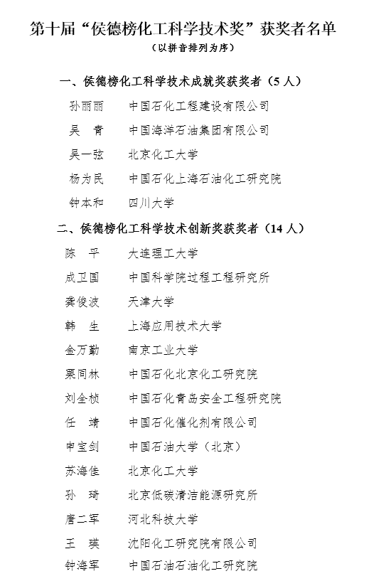同时,在中国化工学会40届二次理事会上,由中国化工学会组织评选的第十届“侯德榜化工科学技术奖”在京揭晓,48位优秀化工科技工作者获得表彰(详情见下图)。其中,我校杰出教授钟本和等5位同志获得第十届“侯德榜化工科学技术成就奖”。