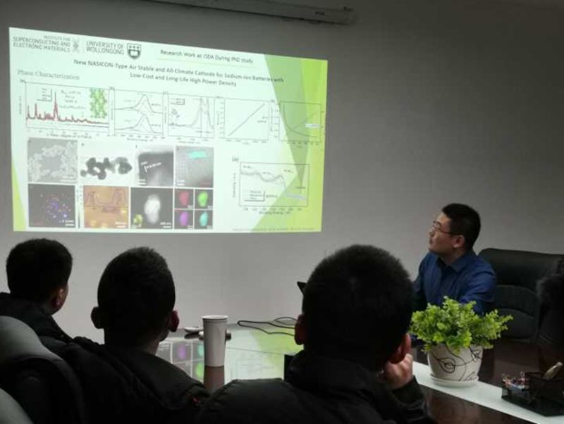 交流会上,陈明哲博士围绕“铁基聚阴离子钠离子电池正极材料”这一主题,结合自己在国外求学期间的科研成果和实践经验,不仅阐述了清洁的电化学能源在可持续发展能源中的重要作用和意义,同时也积极和大家分享其研究思路,分析问题角度等问题,鼓励大家大胆自由创新,同时严谨求证实验设想,脚踏实地专注科研。