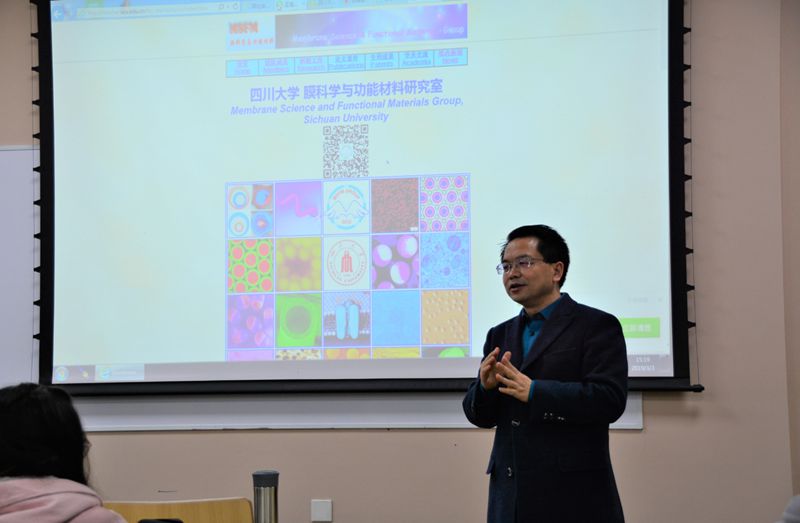 会议由文国宇同学精心策划,分为导师发言、师生问答和分组讨论三个环节。首先,文国宇同学向2018级化工与制药专业的本科生同学们一一介绍了参与此次见面会的研究室导师们。随后,褚良银教授上台讲话,他首先向所有同学表示欢迎,鼓励大家进入实验室了解学科研究前沿,培养科研兴趣和创新能力。接着,褚老师结合研究室主页向同学们讲述了研究室在膜材料与膜技术、智能控制释放系统和微流控等方向取得的研究进展,同时也展示了膜科学功能材料研究室的团队成员的精神面貌和丰富的研究生生活。在褚老师生动的讲解中,与会的同学们被成就卓越的导师团队、精妙实用的科学研究、多姿多彩的组内生活深深地吸引。紧接着,Yousef Faraj副教授就“如何在本科学习生涯取得成功?”这一主题进行发言,他提出“Don’t study hard, but study effectively.”让在座的同学们耳目一新。他提出对待学习需要主动积极的态度以及高的学习效率,并针对如何提高学习效率提出的五点具体建议,得到了与会同学们的一致赞同。虽然Yousef Faraj副教授全程使用英文发言,但这没有阻碍师生之间的交流,现场互动频繁,气氛十分活跃。导师发言环节最后,魏竭老师介绍了位于江安校区的实验教学中心公共平台,鼓励同学们根据自己的兴趣积极参与实验、锻炼动手能力,并借用学院提供的丰富教学资源学习进步。
