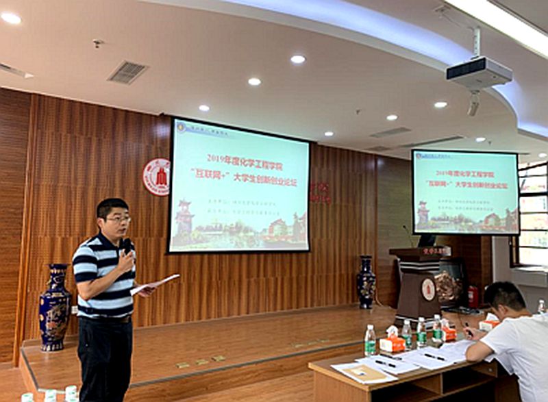 本次论坛首先邀请了第三届中国“互联网+”大学生创新创业大赛国赛金奖项目“Niceky自抗凝性高通量血液透析器”成员刘志航同学进行路演。刘同学以国赛标准从项目背景、项目发展情况及未来预期等方面为大家做了详细介绍,并分享了参赛经验。之后,化工学院入围2019年“互联网+”大学生创新创业大赛校赛的11支参赛团队按顺序进行项目路演,对项目产品/服务介绍、市场分析及定位、商业模式、营销策略、财务分析、风险控制、团队等进行了介绍。