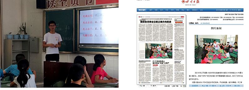 2017年暑期,他带领17名队员赴四川广安悦来镇开展支教活动,为当地的孩子介绍外面的世界,激发他们的学习兴趣,给他们带去梦想和希望,《四川日报》跟踪报道;