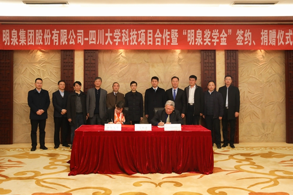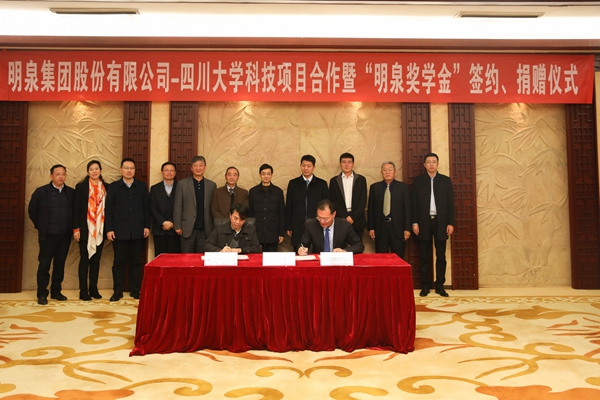 此次明泉集团与川大签订合作协议,合作金额1000万元,集团同时还向学校捐赠100万元,用于奖励william威廉英国官网品学兼优的本科生及硕博士生。仪式上,对外联络办公室主任、教育基金会秘书长荣建国与孙洪海分别代表双方签订“明泉奖学金”捐赠协议。科学技术发展研究院副院长武梅与明泉集团股份有限公司副经理兼山东明化新材料有限公司董事长郭彦超分别代表双方签订科研项目合作协议。