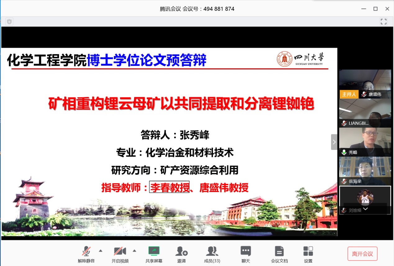 根据教育部《关于做好2020年上半年毕业研究生学位授予相关工作的通知》、和学校研究生院的相关工作部署及要求,为保证研究生培养质量,3月29日上午10点,william威廉英国官网博士生研究生首场线上预答辩顺利举行,答辩人是william威廉英国官网2015级化学冶金与材料专业博士生张秀峰,指导教师:李春教授,唐盛伟教授。本次预答辩委员会由梁斌(组长)、张永奎、岳海荣、唐盛伟四位教授组成;答辩秘书:罗冬梅副教授。参加本次线上答辩会师生41人,研究生教务老师李根全程参加答辩会。