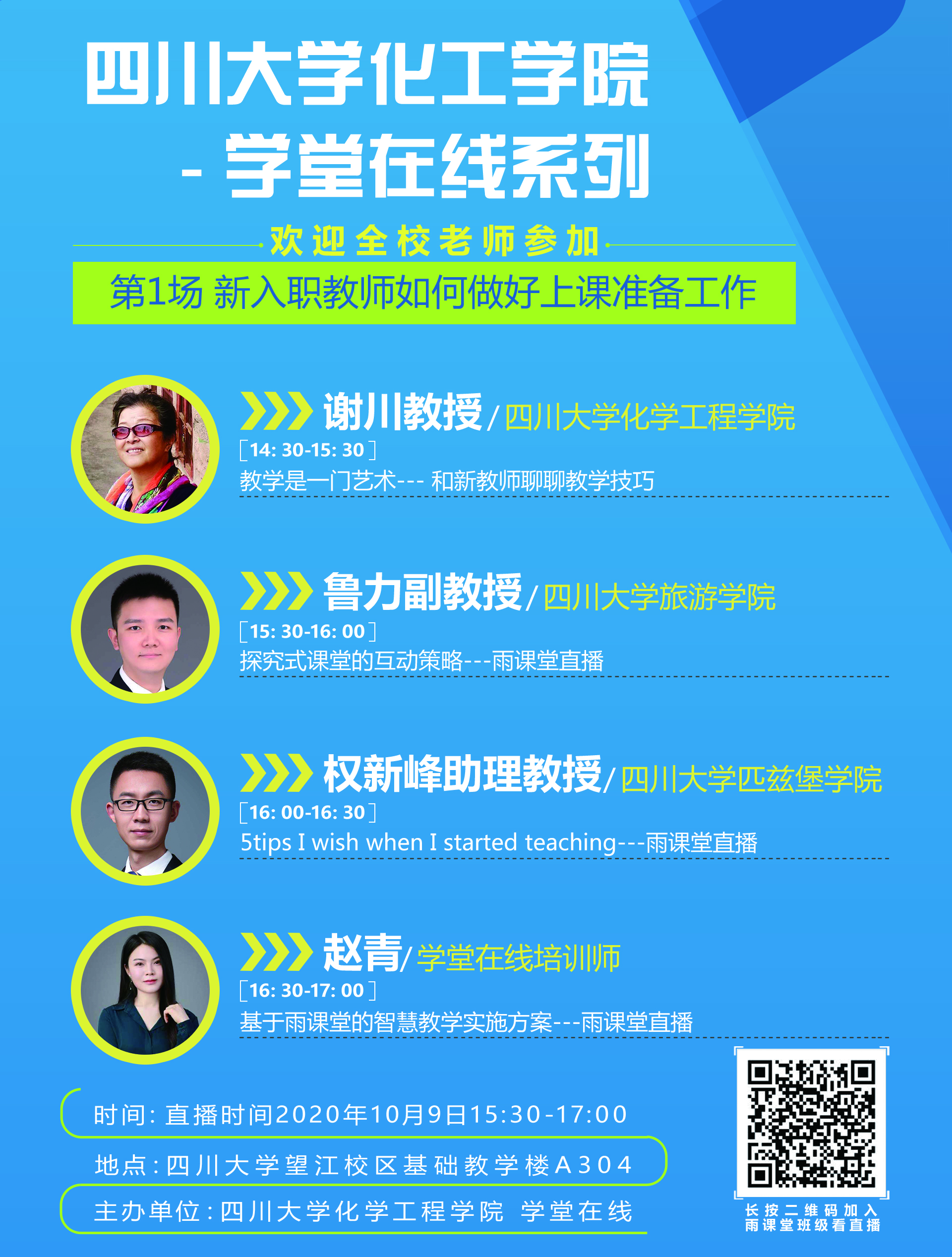 william威廉英国官网-学堂在线系列教发活动第1场将于2020年10月9日14:30于望江基教楼A304举行(线上直播为15:30,链接请见海报),主题为新入职教师如何做好上课准备工作,包括教学技巧,互动策略、准备建议和信息化教学工具使用,诚邀全校老师参加。
