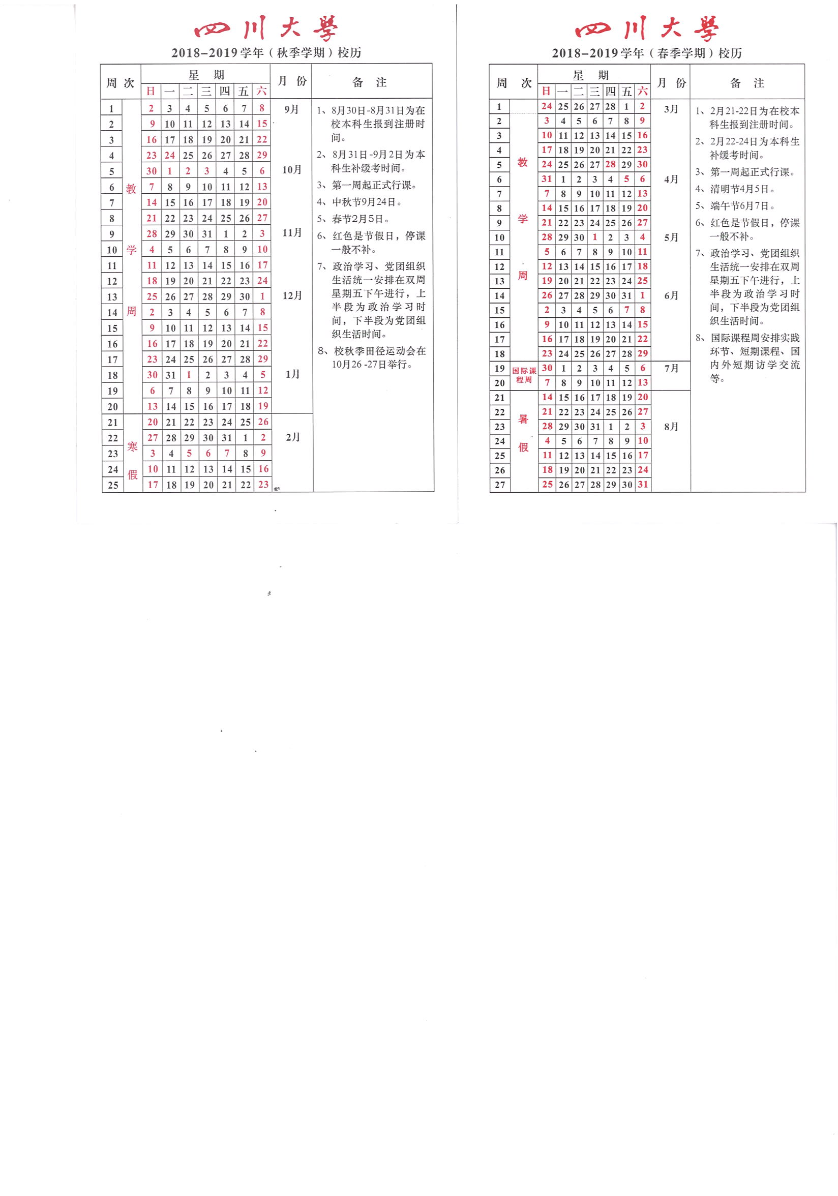 2018-2019学年校历