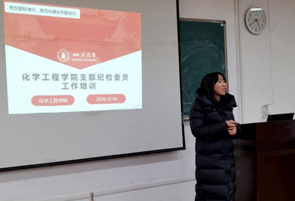 接着,高敏老师从党章中关于纪检委员工作职责、学院党支部纪检委员具体工作职责和怎么做好支部纪检工作三个方面进行了相关工作培训。