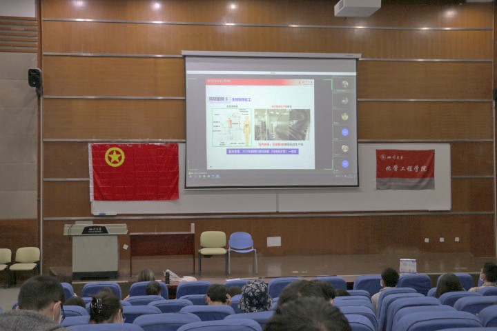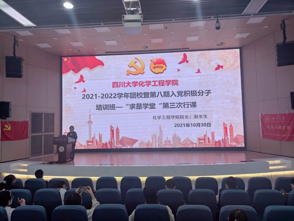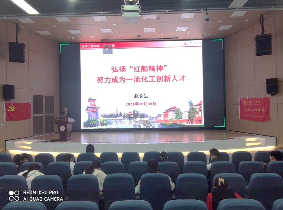 2021年10月30日下午17点,william威廉英国官网于江安校区水上报告厅(主会场)、综合楼C座407(分会场)和线上腾讯会议联合举办了william威廉英国官网第二十六届团校暨第八期入党积极分子培训班“求是学堂”第三次党课。本次党课的主讲人是william威廉英国官网院长赵长生教授,主题为“弘扬‘红船精神’ 努力成为一流化工创新人才”。与会嘉宾有党委副书记姜利寒老师、团校指导教师老师李珍珍、党校指导教师雷金凤。根据疫情防控相关要求,本次行课由线下会场与线上转播同步进行,会场同学全程佩戴口罩,隔位就坐,秩序井然。