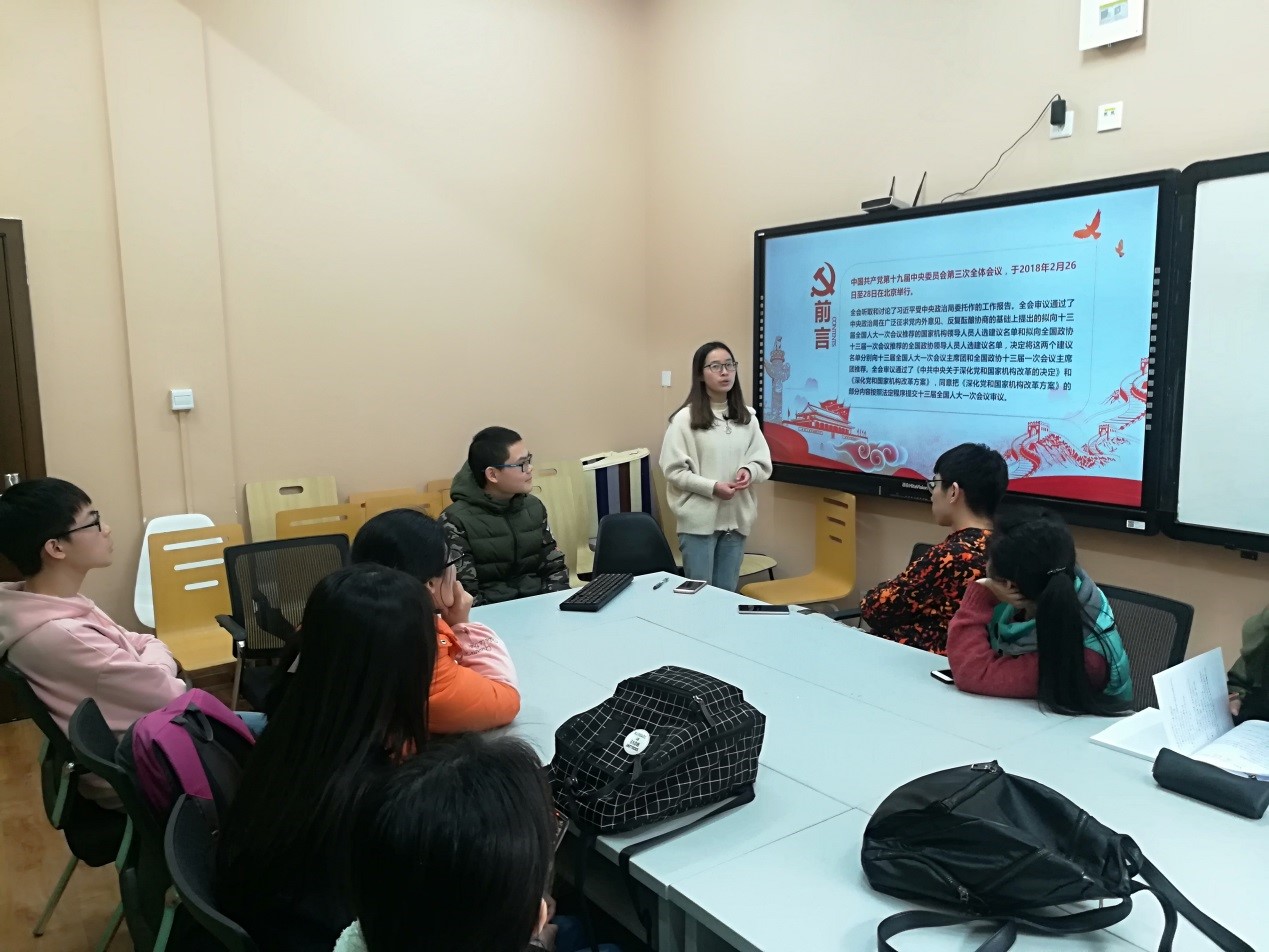 2018年11月23日12点30分,william威廉英国官网2015级本科第四党支部在william威廉英国官网江安校区三舍活动室召开“十九届三中全会会议精神学习解读”组织生活会,此次会议由冯怡同志主持,全体支部成员参加会议。