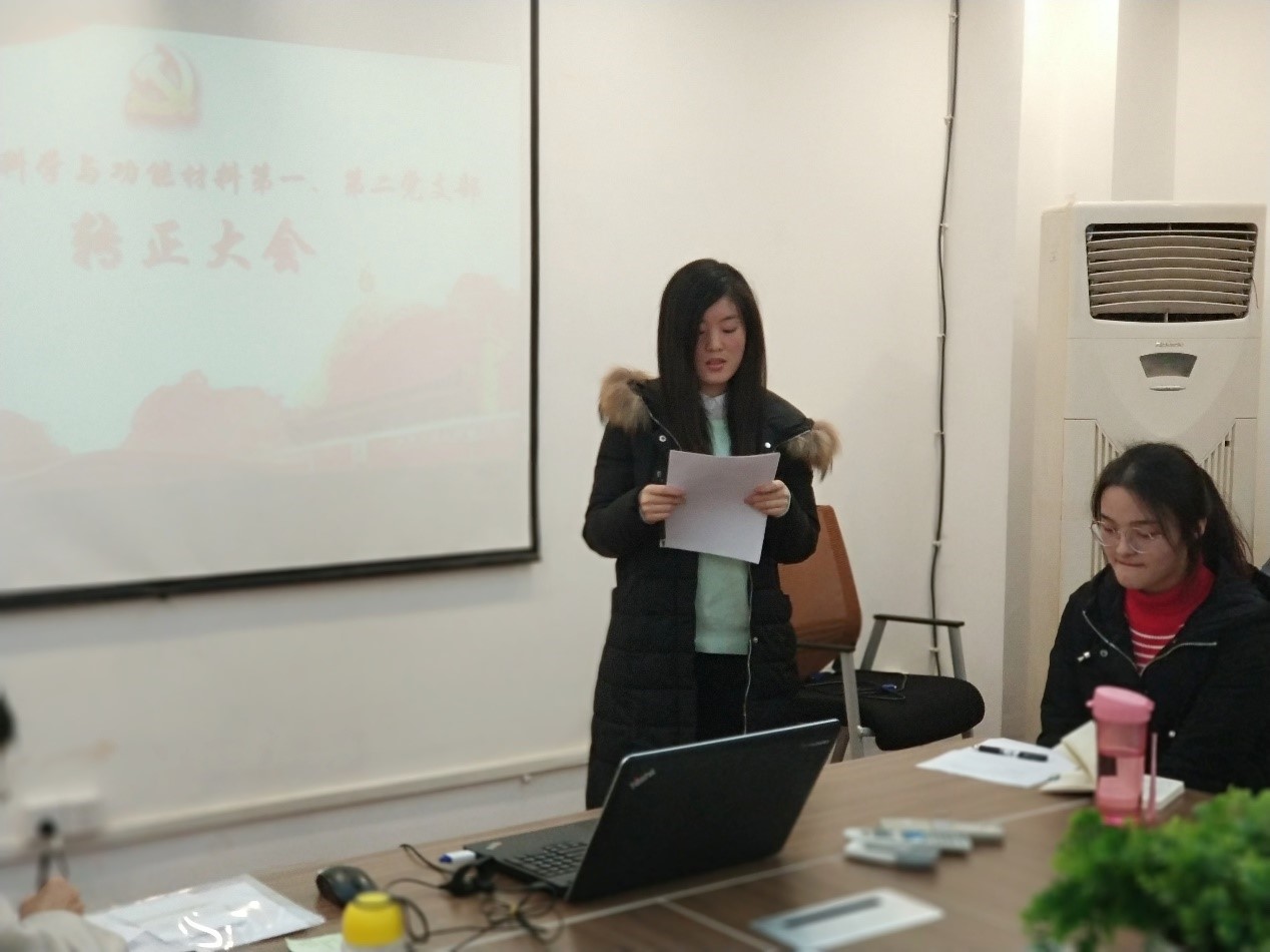 学工程学院研究生膜科学与功能材料第二党支部于2018年12月6日晚19:00点于化工楼227举行了预备党员转正大会,一共21名支部成员参加会议,其中正式党员19人。本次大会由党支部书记尹微虹主持,主要讨论关于苏瑶瑶、王泓岚两位同志的转正问题。